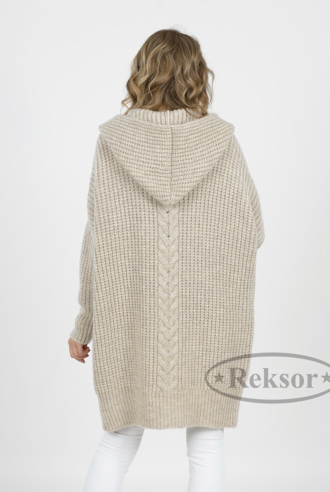 Sweter Ania to ciepły i stylowy model w odcieniach beżu, jasnego i ciemnego szarości. Wykonany z wysokiej jakości moheru (50%) i wełny (50%), zapewnia komfort oraz wyjątkową miękkość. Długi, luźny fason z kapturem, idealny na chłodniejsze dni, łączący elegancję z funkcjonalnością.