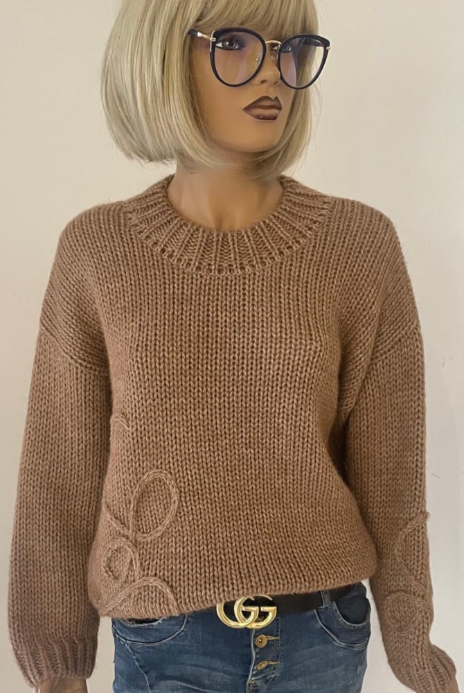 Sweter Lenka to elegancki model dostępny w rozmiarze UNI (40-44) w kolorach ekri i jasnym brązie. Wykonany z wysokiej jakości mieszanki 50% moheru i 50% wełny, zapewnia komfort i ciepło. Posiada ozdobne plecionki na rękawach i dole swetra, nadając mu unikalnego stylu.