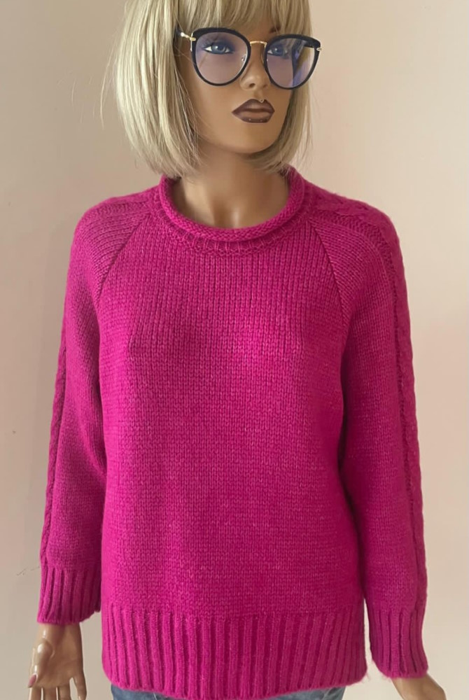 Sweter Mary to ciepły i elegancki model w uniwersalnym rozmiarze 44-46, dostępny w kolorach beżowym i różowym. Wykonany z mieszanki 50% moheru i 50% wełny, zapewnia komfort i miękkość. Dodatkowo, ozdobne plecione wstawki po bokach nadają mu wyjątkowego charakteru.